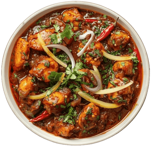 (Chicken on bone cooked in thick tomato masala with black pepper)